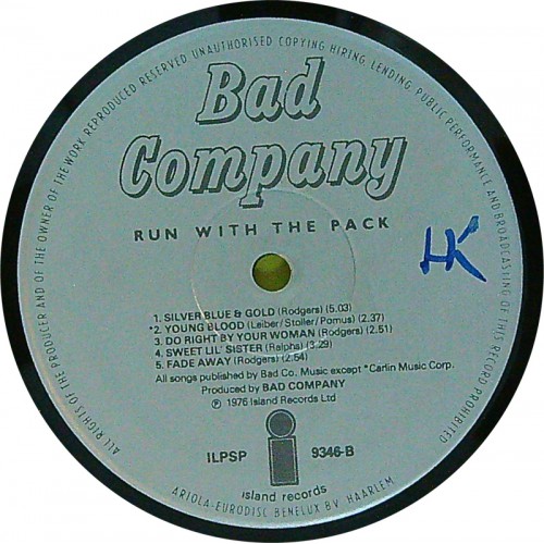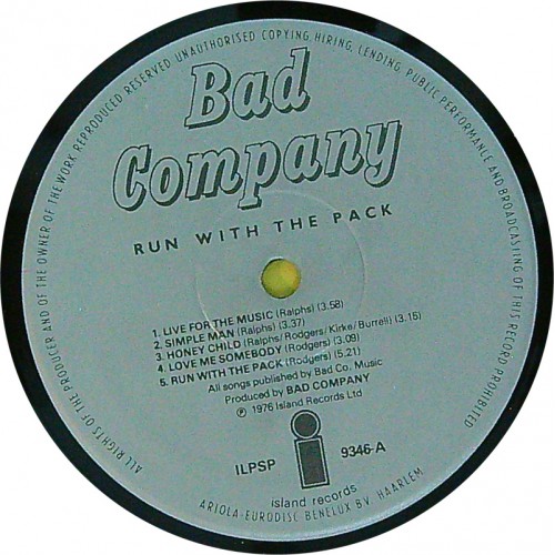 BAD COMPANY - Run With The Pack (Island Records – ILPSP 9346) Holland 1976 gatefold metal foillaminated LP (Hard Rock) | vinyl: NM (mint-)| cover: VG++ (excellent) gatefold initials on cover and label. | Gatefold sleeve is metal foillaminated. | Underlining of text and circle around the wolfpack in embossed print.