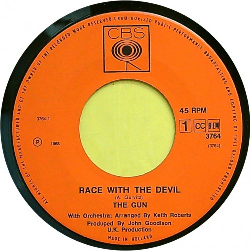GUN - Race With The Devil / Sunshine (CBS 3764) Holland 1968 PS 45 (Hard Rock, Blues Rock, Psychedelic Rock) | vinyl: VG++ (excellent) | cover: G (good) some heavy split seams and also tear in front cover --> see photos