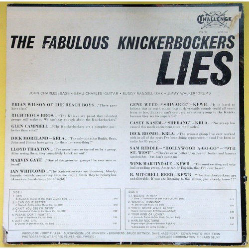 THE FABULOUS KNICKERBOCKERS - Lies (Challenge CHS 622) USA stereo 1966 LP (Garage Rock, Pop Rock)| vinyl: VG+ (side one plays great (VG++) - side 2 (VG) has some side noise and some ticks) | cover: VG++ (excellent)