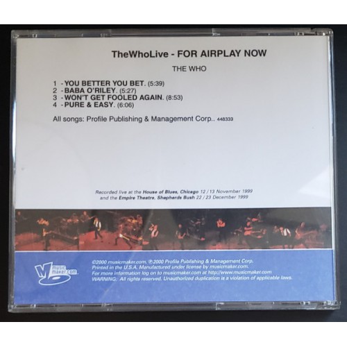 WHO, THE - The Who Live - FOR AIRPLAY NOW (Musicmaker.com – none) USA 2000 4-track PROMO CD | CD, booklet and inlay NM (mint-) This is the 4-track advance sampler sent to radio stations. The 2-cd booklet insert is the same as the official 2-cd version.