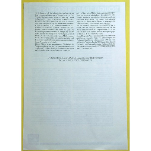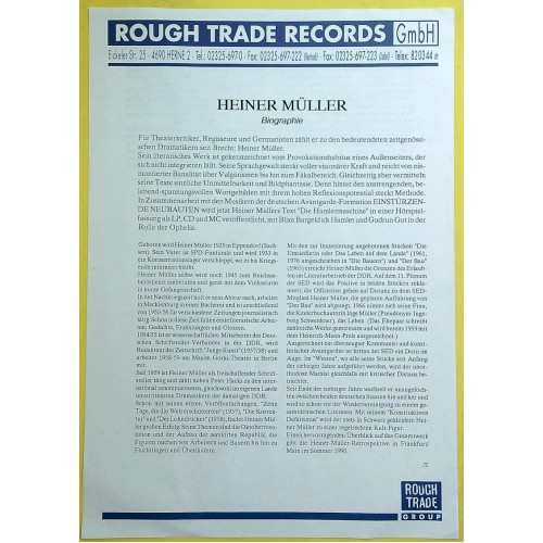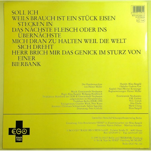 Heiner Müller/ EINSTÜRZENDE NEUBAUTEN Die Hamletmaschine (Rough Trade – RTD 197.1208.1) Germany 1991 original white label test-pressing LP (Electronic, Industrial, Experimental) | vinyl: NM (mint-) | cover: NM (mint-) | comes with Biography Heiner Müller | This is a radio play of the stage play "Die Hamletmaschine" by Heiner Müller.